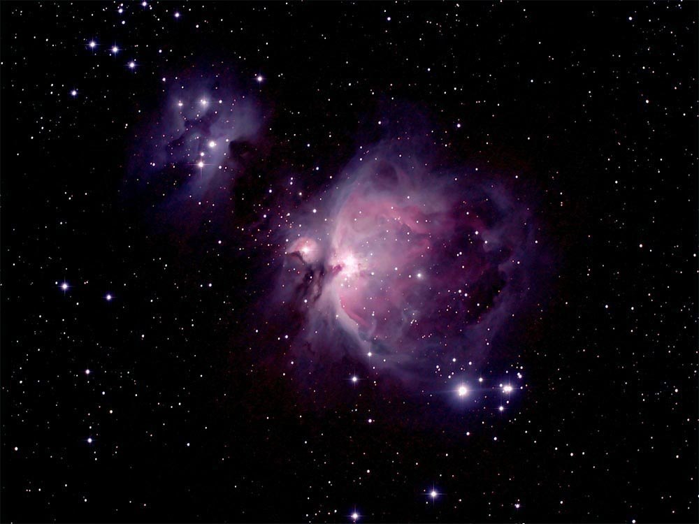 M42 and M43 (center) compose one of the great stellar birthplaces in our galaxy. This image was taken from Megnaritaville (GMARS) in November 2008 through a WO 80mm FD with a .8 flattener/reducer using a Canon EOS 400 (unmodified). It is a composite of images shot with different exposure times in order to preserve detail in the very bright core of the nebula. It was processed entirely on a Mac using Nebulosity, Photoshop CS3 and Leopard Preview. To the upper left is the blue reflection nebula, NGC 1977, often called the Running Man Nebula. See spectra of M42 here.